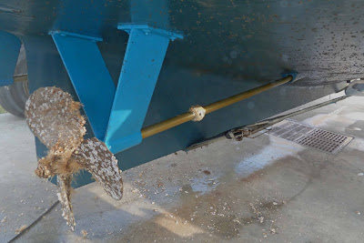 Last Dance, cleaned and new props, ready to go back in the water. A two-hour stop on the first day of the voyage that should provide great improvement in performance for many 1000's of miles.